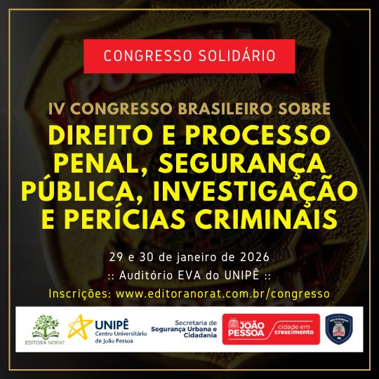 O IV CONGRESSO BRASILEIRO SOBRE DIREITO E PROCESSO PENAL, SEGURANÇA PÚBLICA, INVESTIGAÇÃO E PERÍCIAS CRIMINAIS, promovido pela Editora Norat, Centro Universitário de João Pessoa – UNIPÊ e Secretaria de Segurança Urbana e Cidadania – SEMUSB, tem por escopo promover o debate, a troca de informações, vivências práticas e de conhecimentos sociais, científicos e acadêmicos no campo das Ciências Criminais, da Segurança Pública e Investigação e Perícias Criminais, através da interação entre os professores, doutrinadores, pesquisadores e profissionais, que, de maneira transdisciplinar, abordarão temas sobre o complexo fenômeno da violência e seus impactos na sociedade e nas ciências criminais.